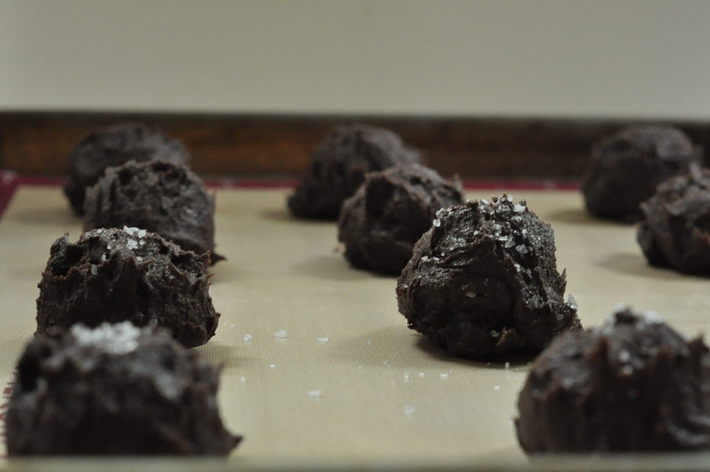 Cream the butter and sugars together until well blended. Add the eggs one at a time, mixing well after each addition. Mix in the Kahlua. Gradually stir in the flour mixture. Once it is all mixed in well add the chocolate chips and mix well. Place by heaping spoonfuls on a cookie sheet (I use Silpat, parchment paper also works well). If desired, sprinkle the tops of the cookies with sea salt. Bake for 9-11 minutes.
