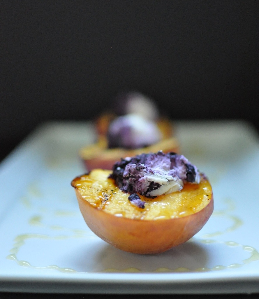 It doesn’t get any easier than this scrumptious peach. Not only is it easy, but you can make it in small amounts too. That can’t be said for cakes, cookies or other desserts! Just slice a peach (or however many you want) in half and remove the pit. Rub a little oil on the cut side. Place cut side down on a hot grill. With lid closed cook for about 5 minutes. Place on a plate, drizzle with honey and fill the middle with a spoonful of goat cheese. Regular goat cheese works but blueberry vanilla is simply divine!