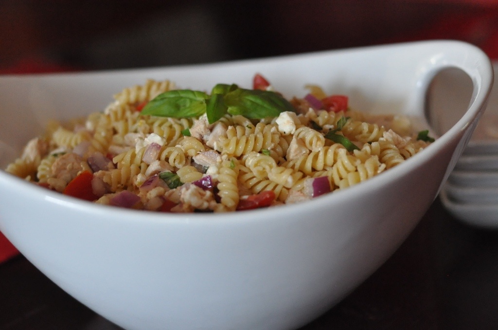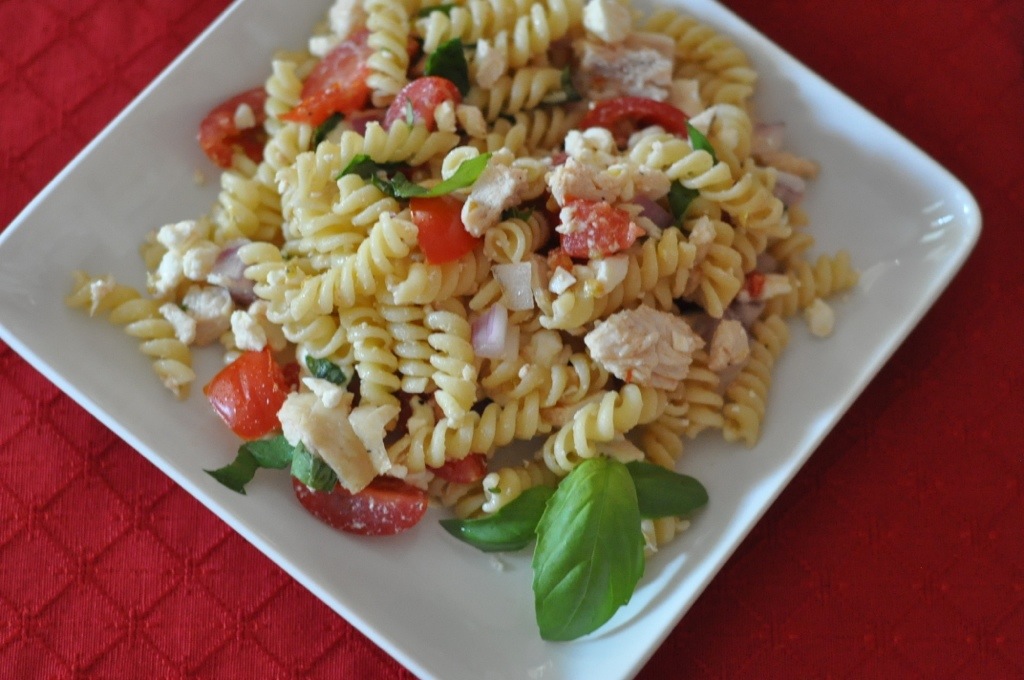 Cook the pasta to al dente, time will depend on which size/shape pasta you choose to use. Drain the pasta. Put the pasta, oil, lemon juice and zest in a bowl, allow to cool for about five minutes. Add the rest of the ingredients and stir until well mixed. Serve warm or cold. If serving cold cucumbers are a nice addition.