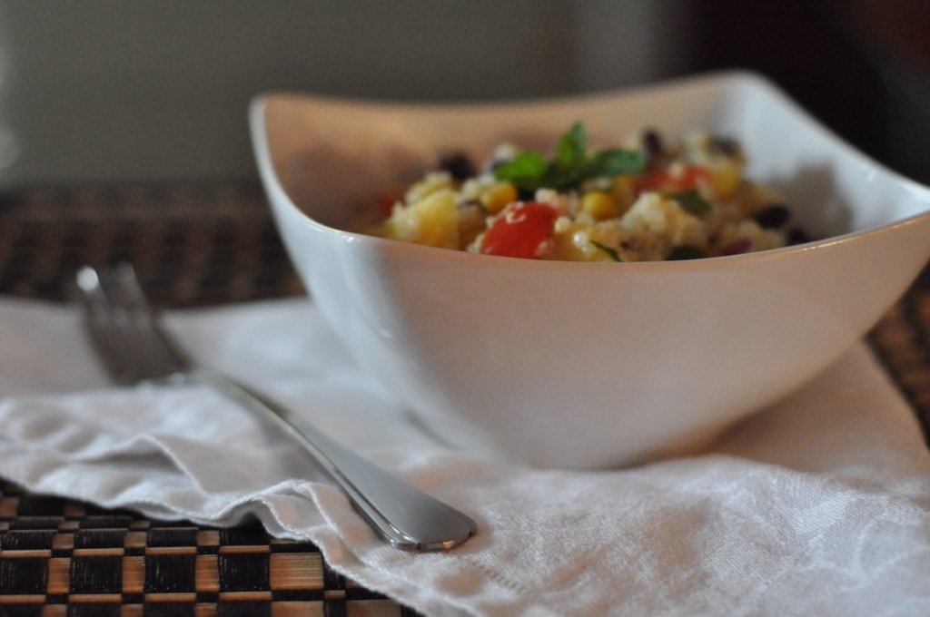 I am a fan of quinoa, the rest of my family not so much. I tried coming up with ways to fix it so that the kiddos wouldn’t complain much. The way to their hearts, or stomachs as the case may be, is definitely fruit. I already planned on using some black beans I made earlier with peppers from the garden and decided pineapple was the way to go.