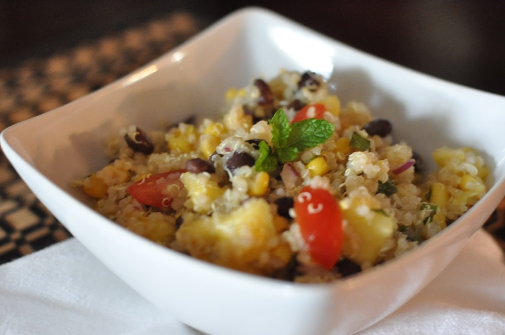 Once the quinoa is cooled add the corn, black beans, pineapple, tomato, onion and mint. Stir all together.
