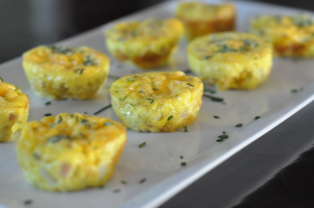 Whisk together the eggs and milk or cream. Add the salt and pepper and whisk well. Evenly place the potatoes in the muffin tins, followed by the ham and then the cheese. Evenly spread the whisked eggs into the muffin tins and sprinkle with chives on top. Bake for 20 minutes.