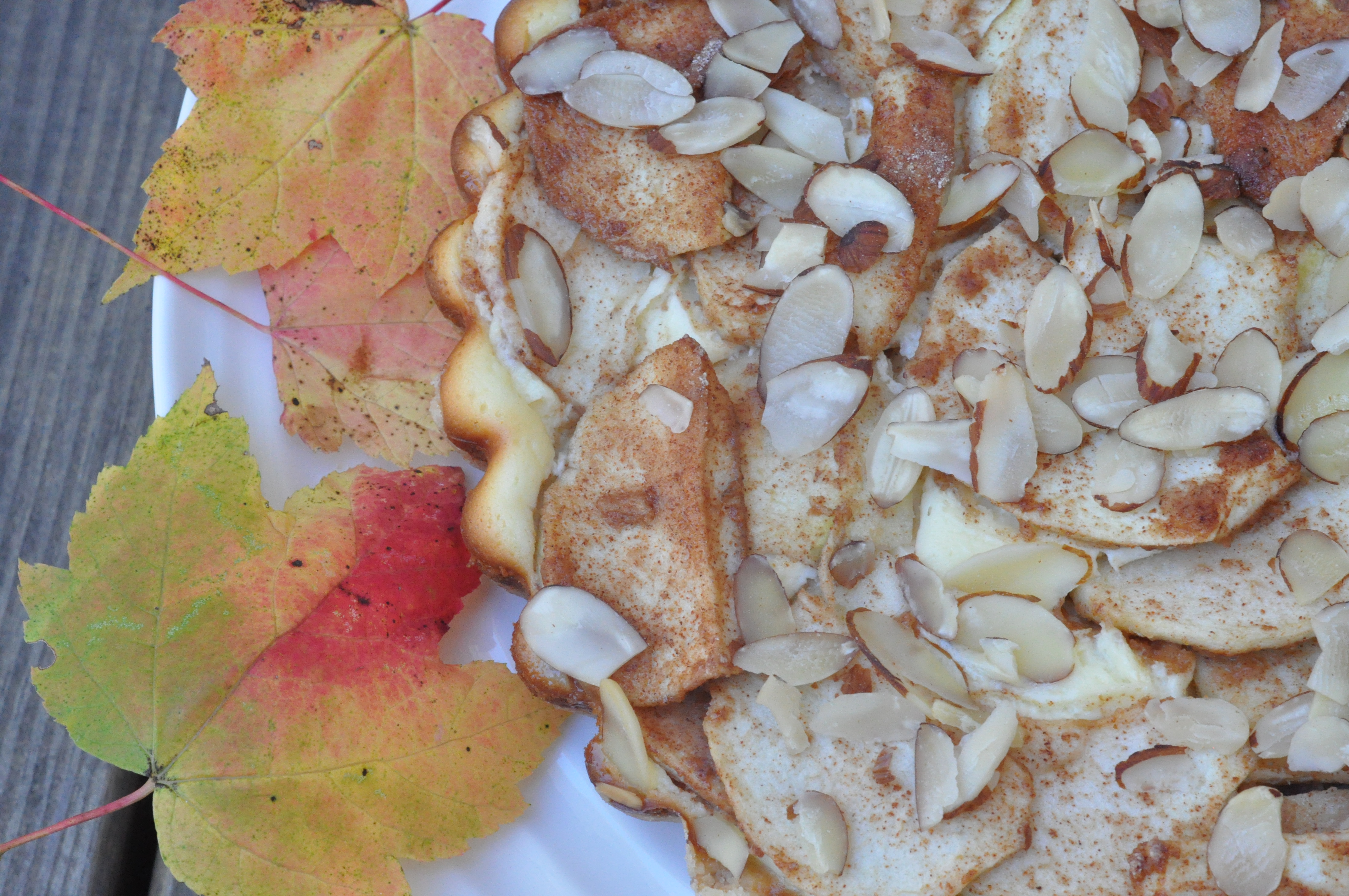 Combine the flour, sugar, cinnamon and nutmeg. Add the apple slices and toss to coat. Overlap the apple slices in a circular pattern over the cream filling. Sprinkle the top with the sliced almonds. Bake for 50 minutes or until the filling is set.