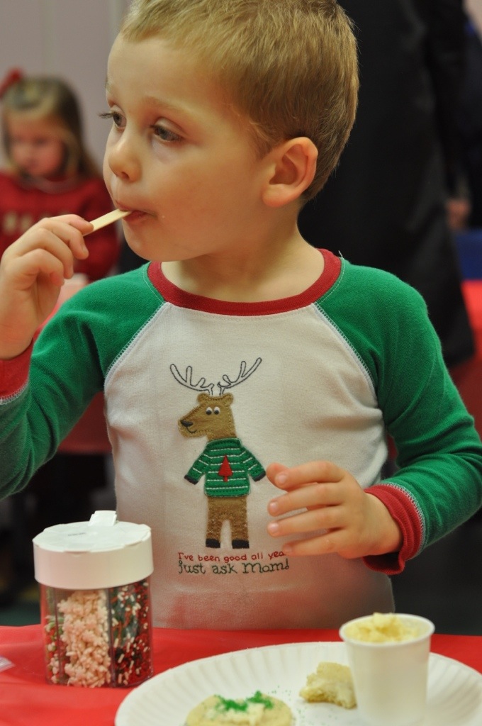 I was the volunteer for the cookie activity and I must say it was quite entertaining. Each child got a bag with three sugar cookies and a small shot sized cup of frosting with a Popsicle stick to spread it. There were multiple bottle of sprinkles on all the tables. Needless to say I saw many cookies with LOTS of sprinkles. Many kids ate the extra frosting right off the sticks. Finally at the end I saw one girl pour sprinkles in the frosting and eat it! Frankly I expected one of my boys to try that!