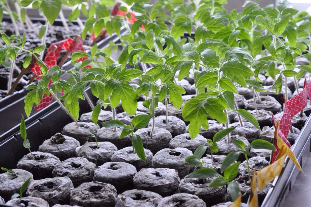 This flat is mostly tomato plants, the smaller ones in front are peppers.