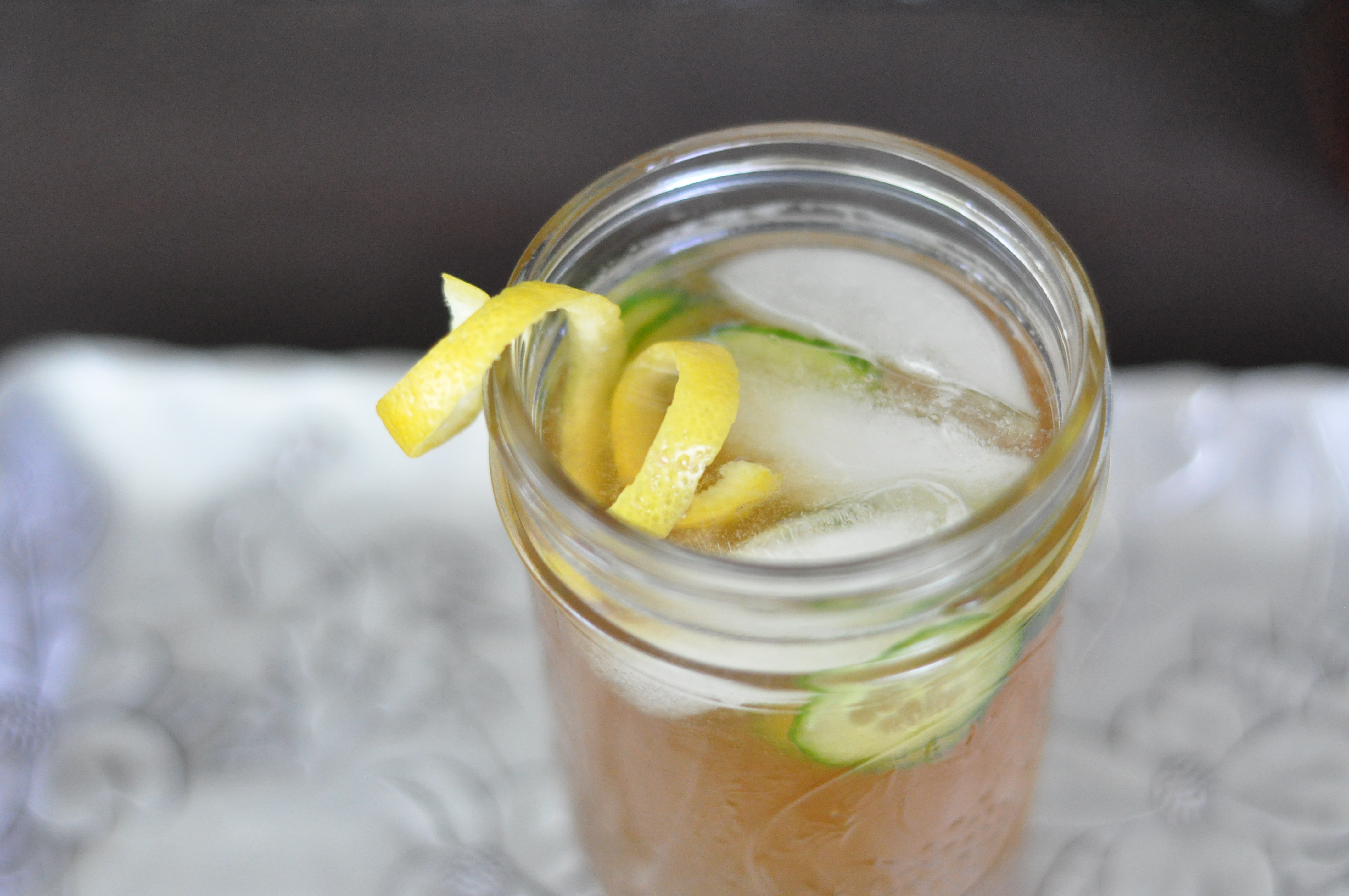 Slice a small piece of the lemon peel off, avoiding the pith. Rub the peel inside two mason jars with the oily side against the glass. Next rub the cucumber slices on the inside of the jars, they should stick and stay in place. With the rest of the lemon take off some strips of peel for the twists.