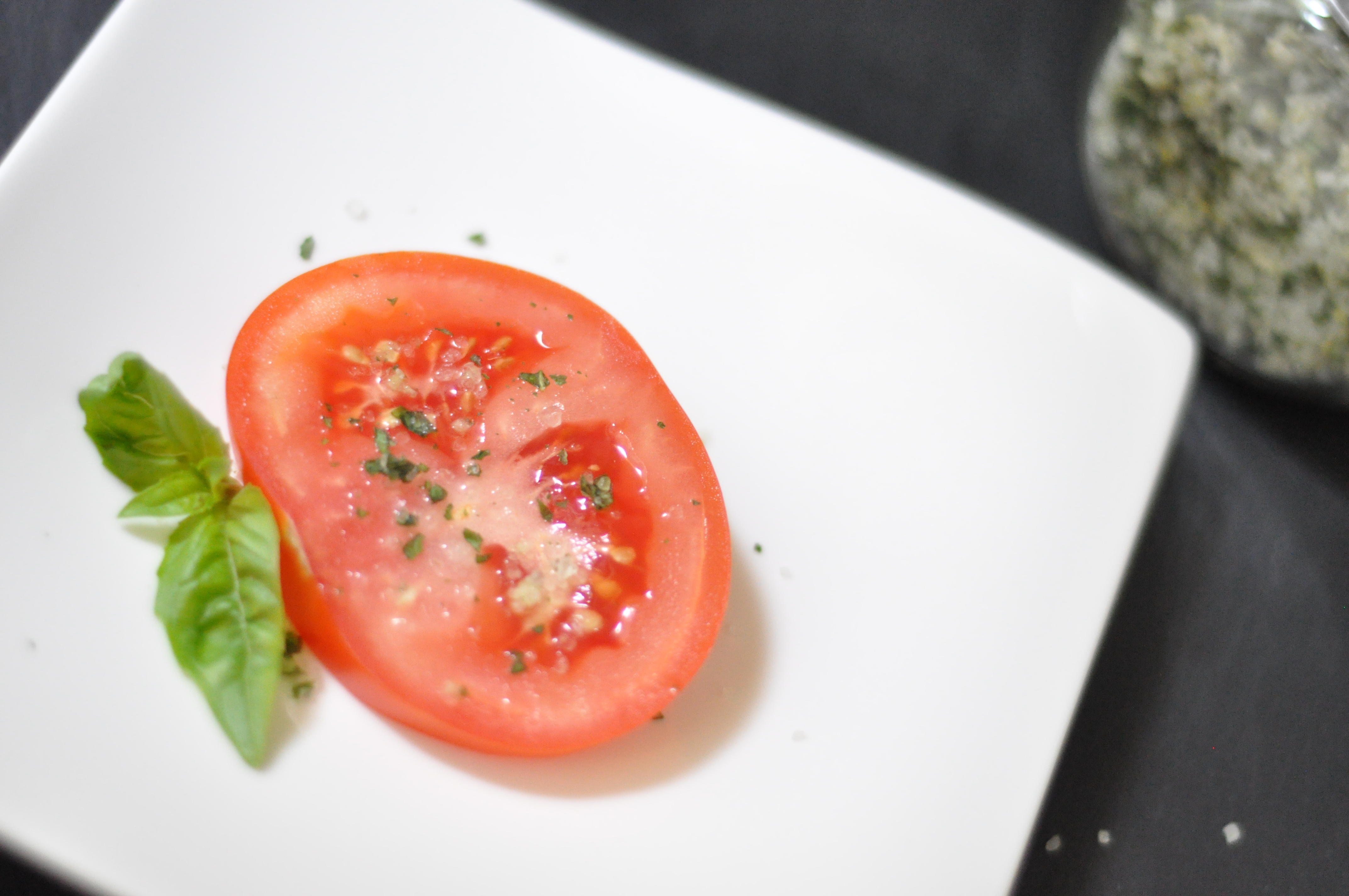 My other favorite way to eat tomatoes is in the form of a caprese salad. So I figured why not put the basil in the garlic salt instead of parsley. Now I will be able to enjoy a fresh tomato with basil, without having to make an entire caprese salad every time. Don’t get me wrong, I will still be eating tomatoes, basil and mozzarella in just about any form imaginable, but this will be quick and easy.
