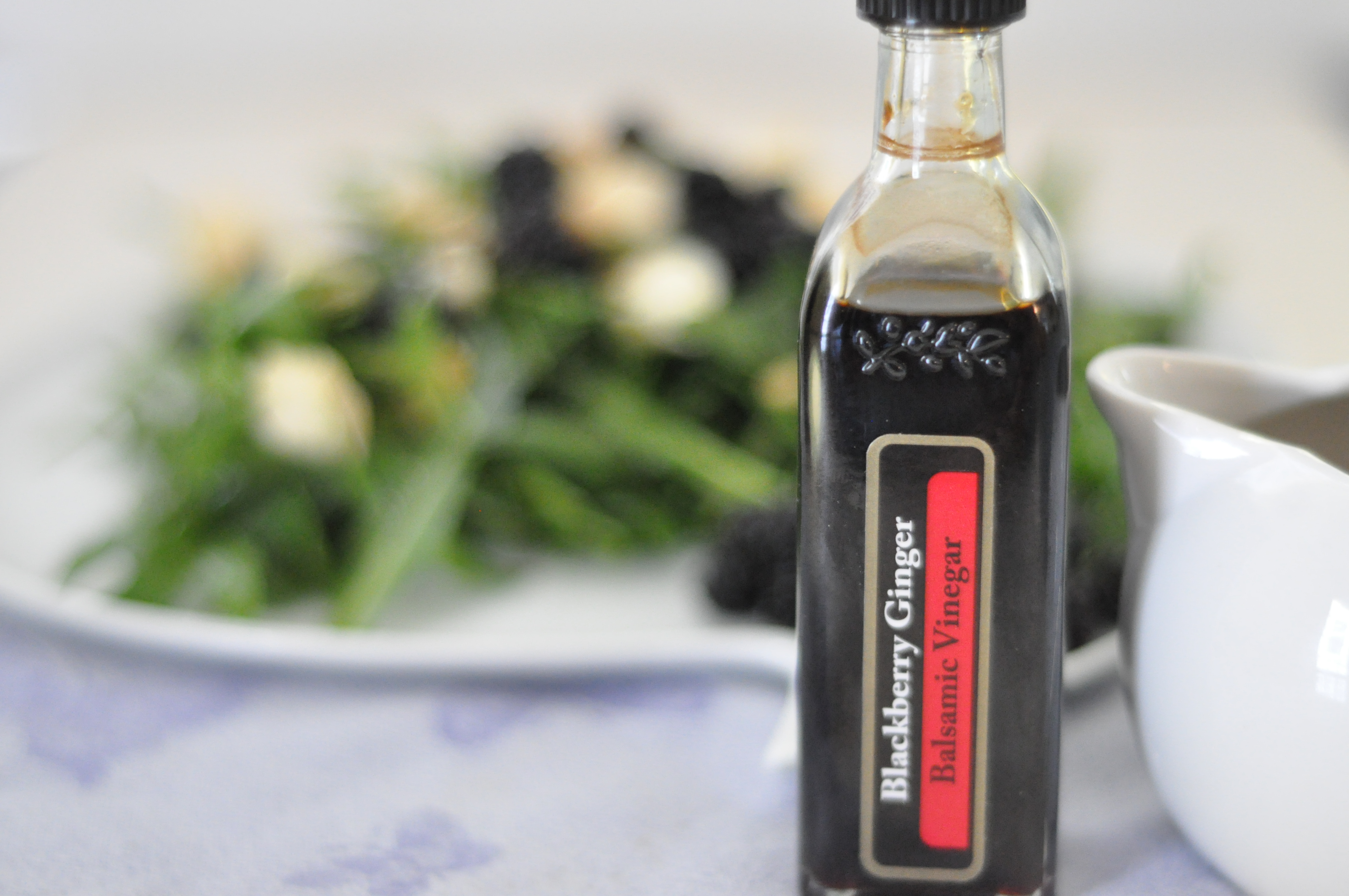 As I was getting ready to make a dressing I remembered my stash of goodies. My mom went to visit my brother in Seattle back in March for his birthday and brought me back food. What else would I want?! I have a sampler of infused olive oils and balsamic vinegars, plus something else that will remain a surprise until I am inspired. Anyway, one of the balsamic vinegars is blackberry ginger flavored. Perfect for my salad!  You  could easily use regular basmaic vinegar in its place.