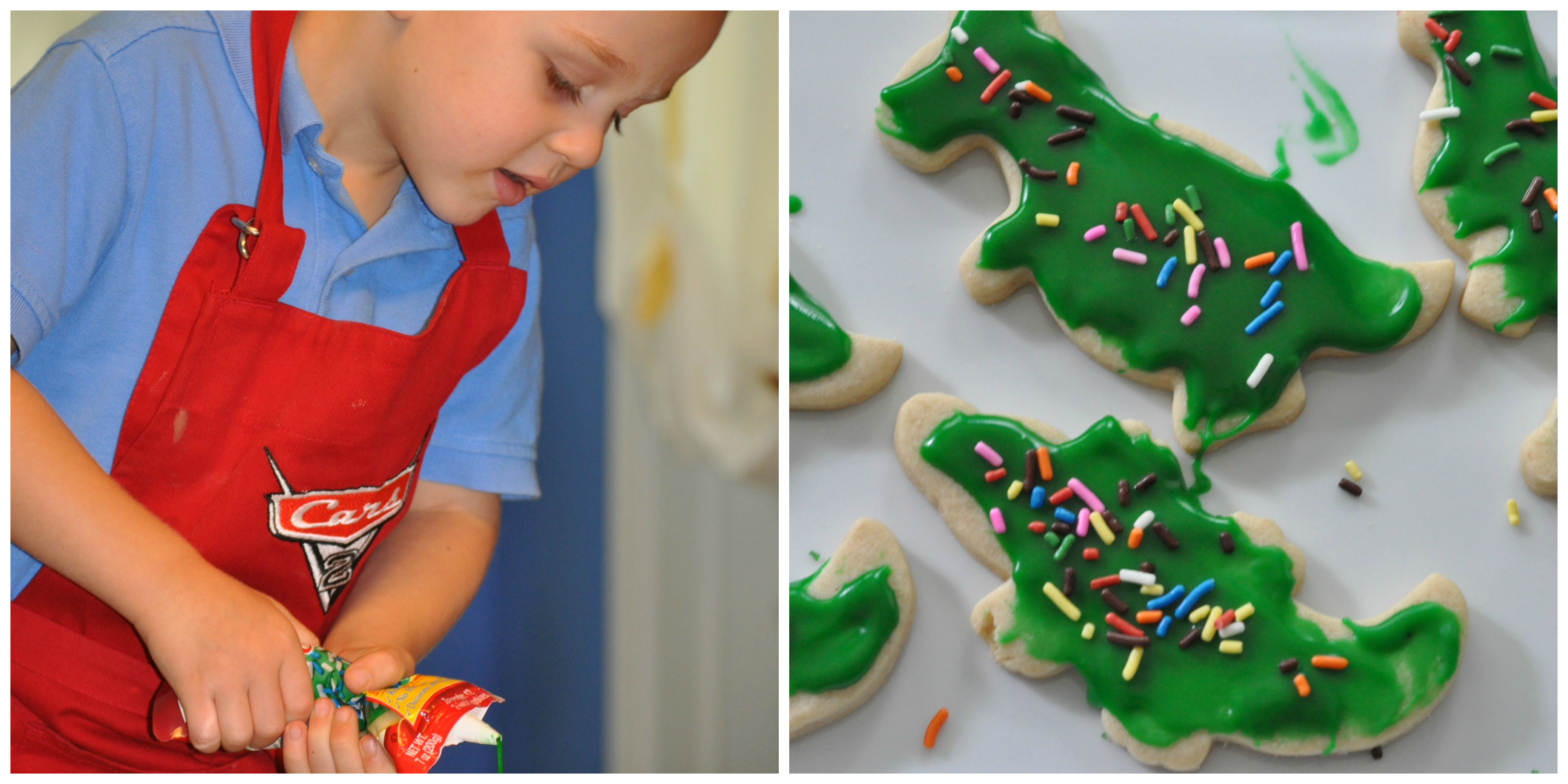 Sean has also been quite the helper in the kitchen this month. He enjoys helping mommy while his brothers are at school. I made him some dinosaur cookies for his birthday and let him decorate them all by himself. He was over the moon THRILLED! Normally I do the decorating since I want them to look nice but this year I figured we would eat them ourselves and Sean could have at it.