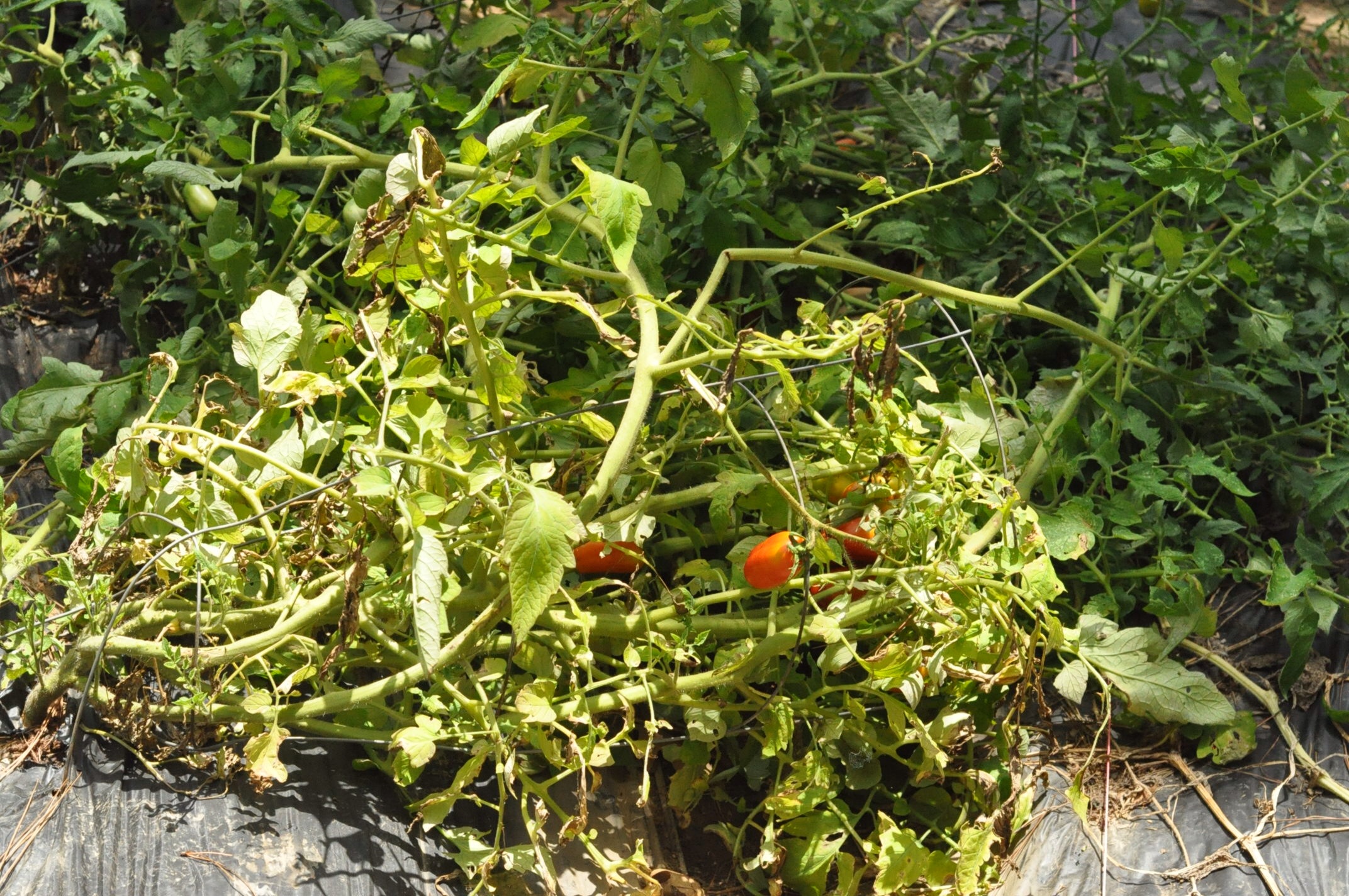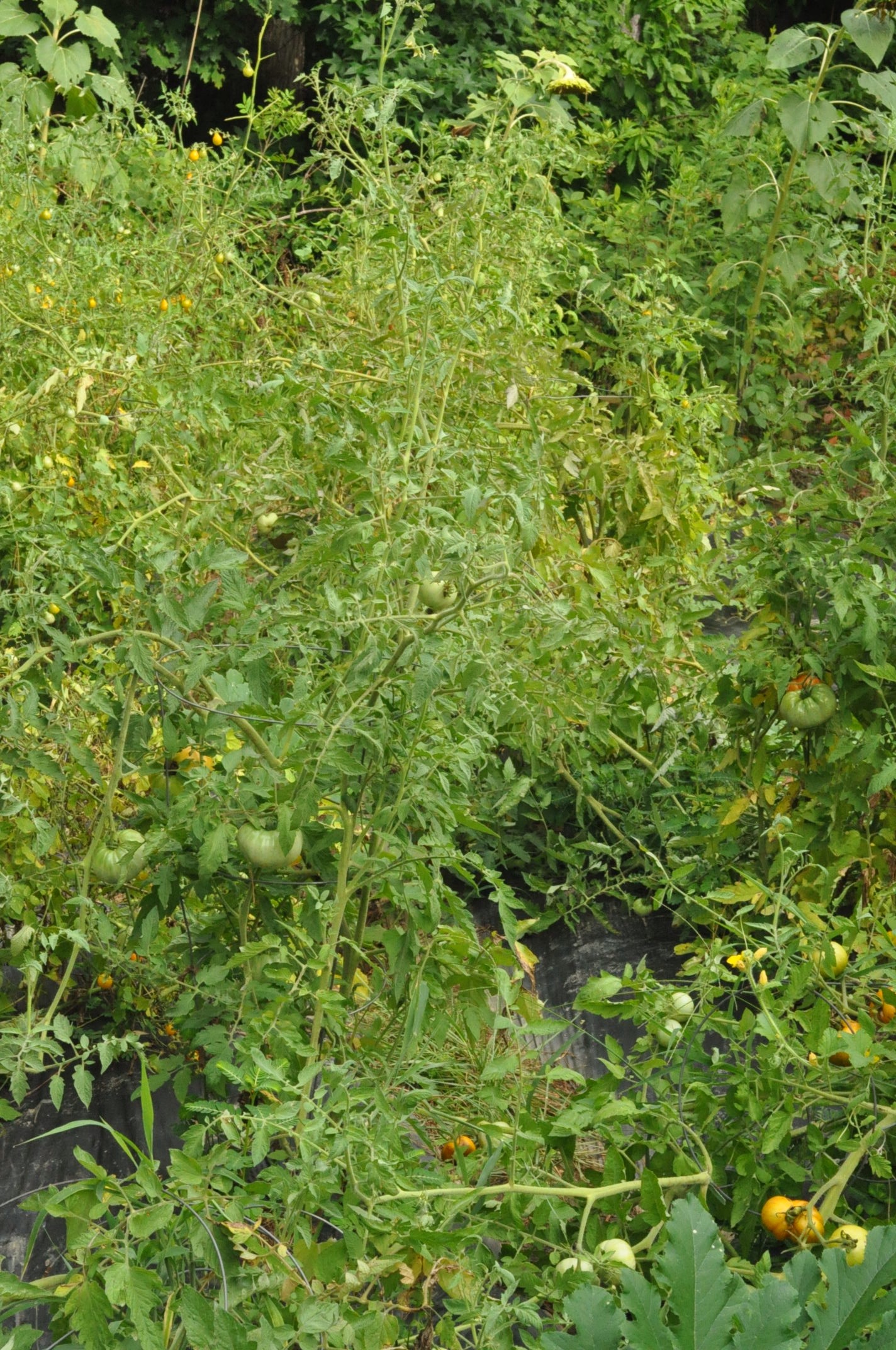 It may be difficult to see in some of the photos since it is pure tomato madness, but many of the plants have fallen over. They just refuse to be staked up, we need a telephone pole to hold them! Since I’m the only person that really eats tomatoes around here I give many away or roast them. When I have two sheet pans full I roast them with olive oil, salt, pepper and garlic. Then they go for a ride in the blender and poured in a quart jar and frozen. So much easier than canning in this heat!