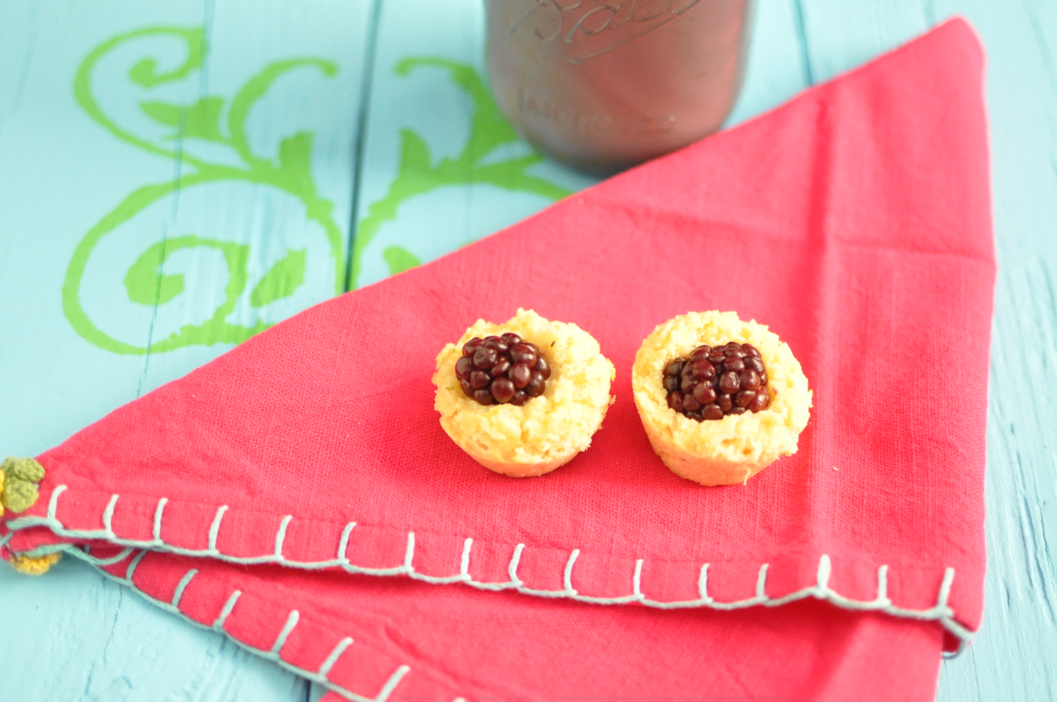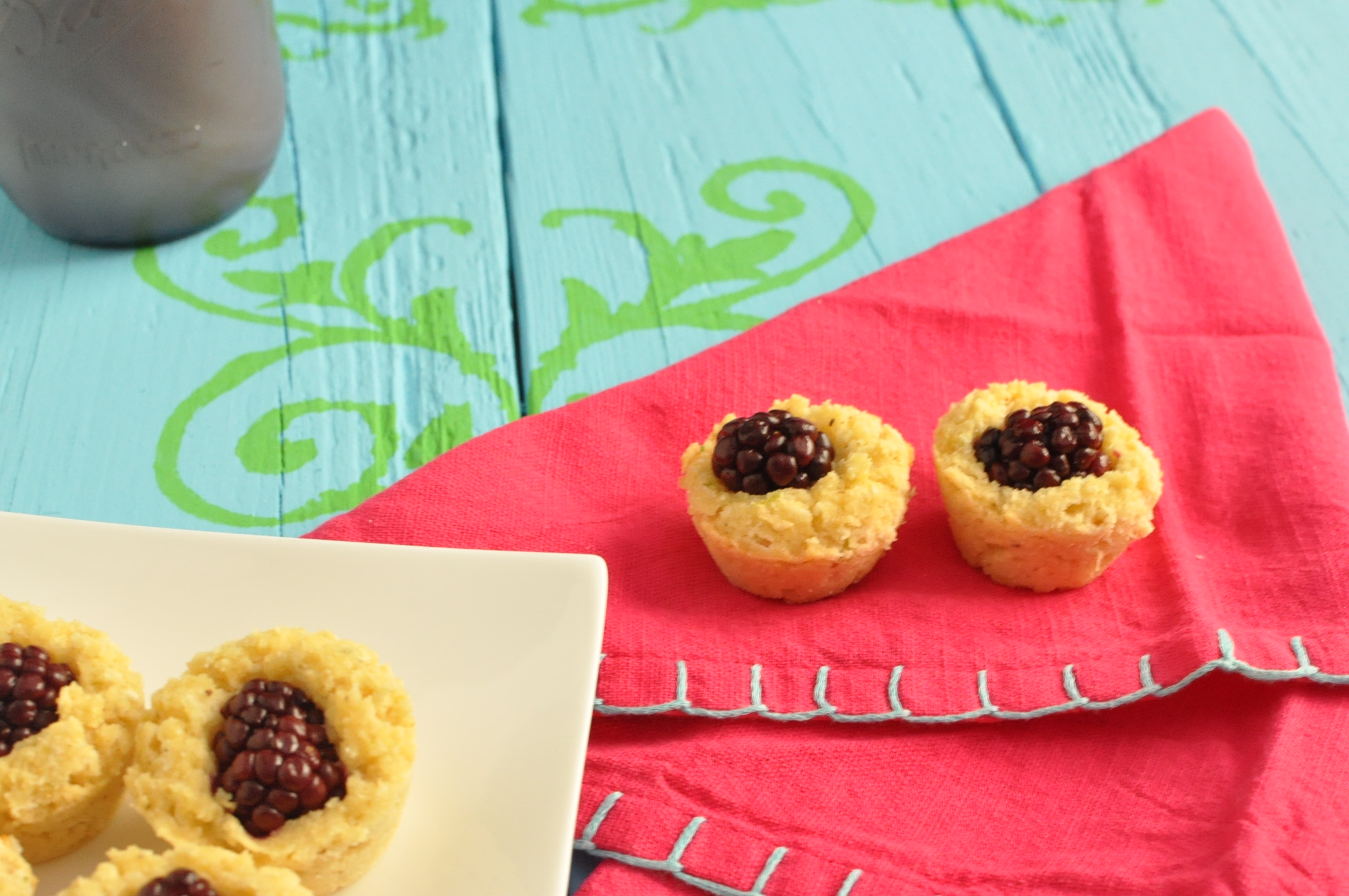 Preheat oven to 350 degrees. Combine the coconut flour, cornmeal, sugar, coconut, baking powder and salt in a bowl and mix together. In another bowl whisk together the buttermilk, coconut oil, eggs, vanilla and lime zest and juice. Pour the wet ingredients over the dry and stir to combine. Fill greased mini muffin pans with about 1 Tbs. per hole and top with a blackberry, bake 13-15 minutes.