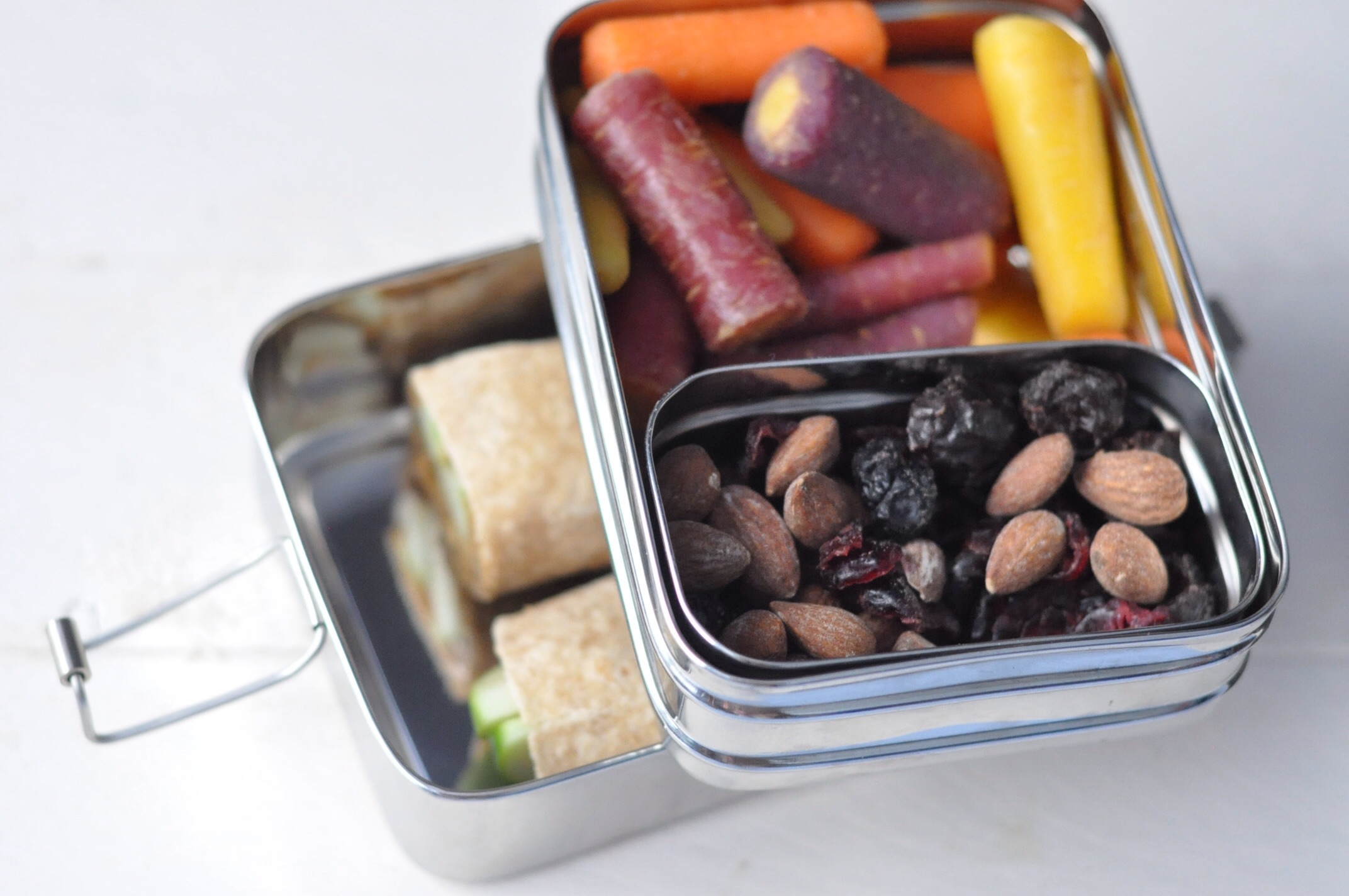 Now to finish off the lunch just add in a veg and some kind of treat if you want. I recently discovered the organic rainbow carrots already cut at my local Kroger. This is a huge hit with my boys, heck they even eat the purple carrots right out of the garden with dirt still on them. I really can’t leave them anywhere near the garden unattended!