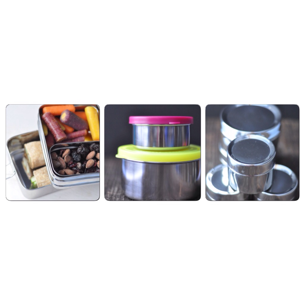 In my kitchen we have new stainless steel containers for packing school lunches or snacks when we are out and about.  I already had one of the containers on the far left but needed another to pack two school lunches.  It is perfect for a sandwich on the bottom and fruit/veg on the top and a small container for fruit and nuts or a treat.