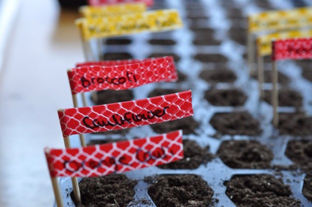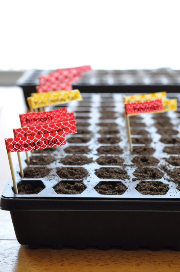So anyway, back to my seedlings for this year.  It’s a pretty simple process and there are many ways to do it.  I like to fill my containers with the soil and then get to work.  I cut skewers short enough that they will fit with the lid once it’s on.  Then I put washi tape on the stick and write the name of the plant.  This is what works for me, everyone is different. You just need to make sure you mark your plants well because once they sprout they all look alike for a while!